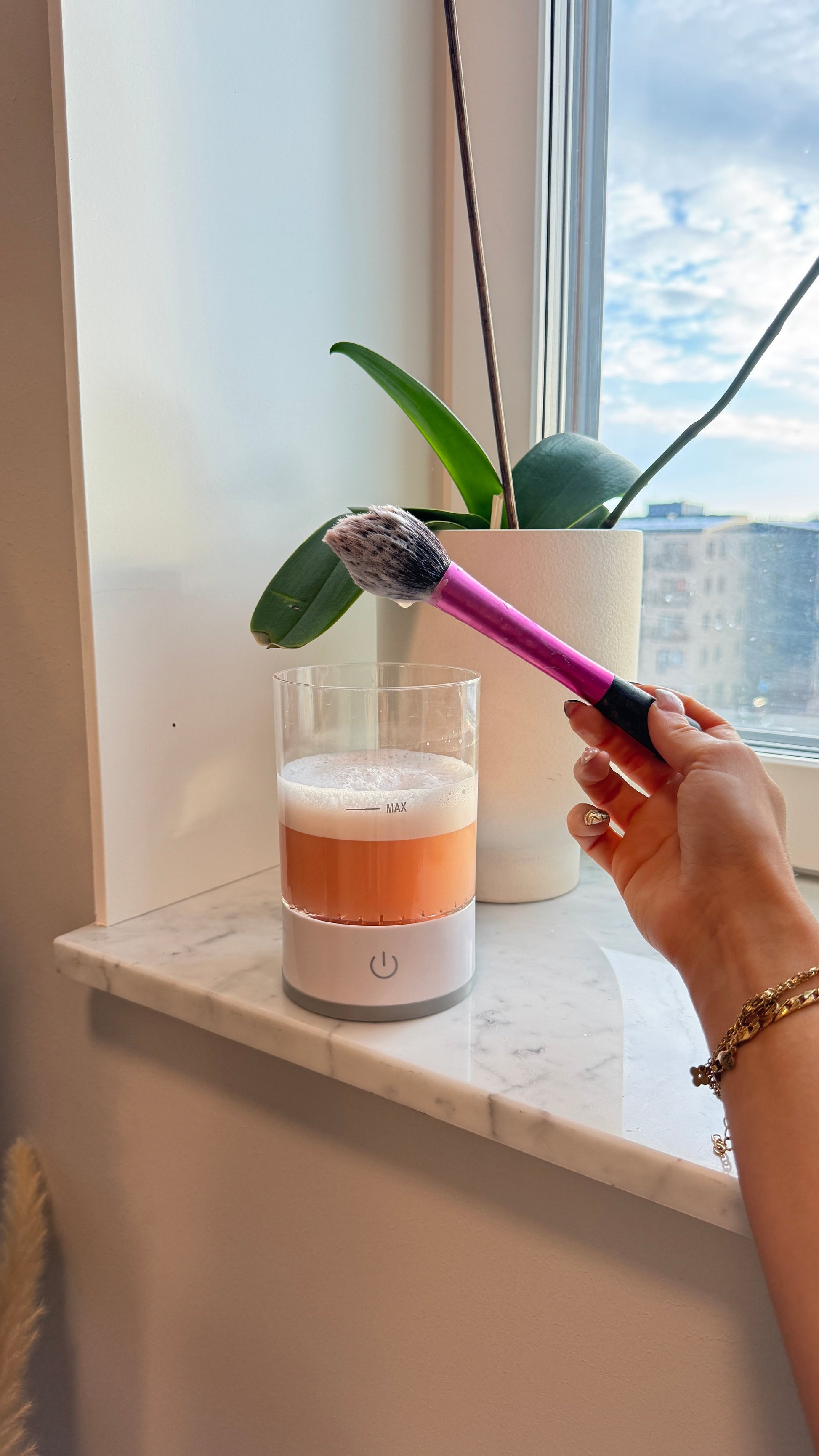 Med vår Lystra™ håller du enkelt dina sminkborstar rena och huden fri från irritation. Fyll på med vatten och rengöringslösning, välj läge och tryck på knappen – resten sköter maskinen!