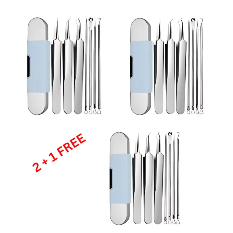 Detta set har ett dubbelhuvat verktyg med ett halkfritt handtag som gör det enkelt att komma åt akne, pormaskar, finnar och fettpartiklar. Den ergonomiska designen möjliggör exakt extraktion och minimerar hudskador. Perfekt för säkra och effektiva hudvårdsbehandlingar i hemmet.