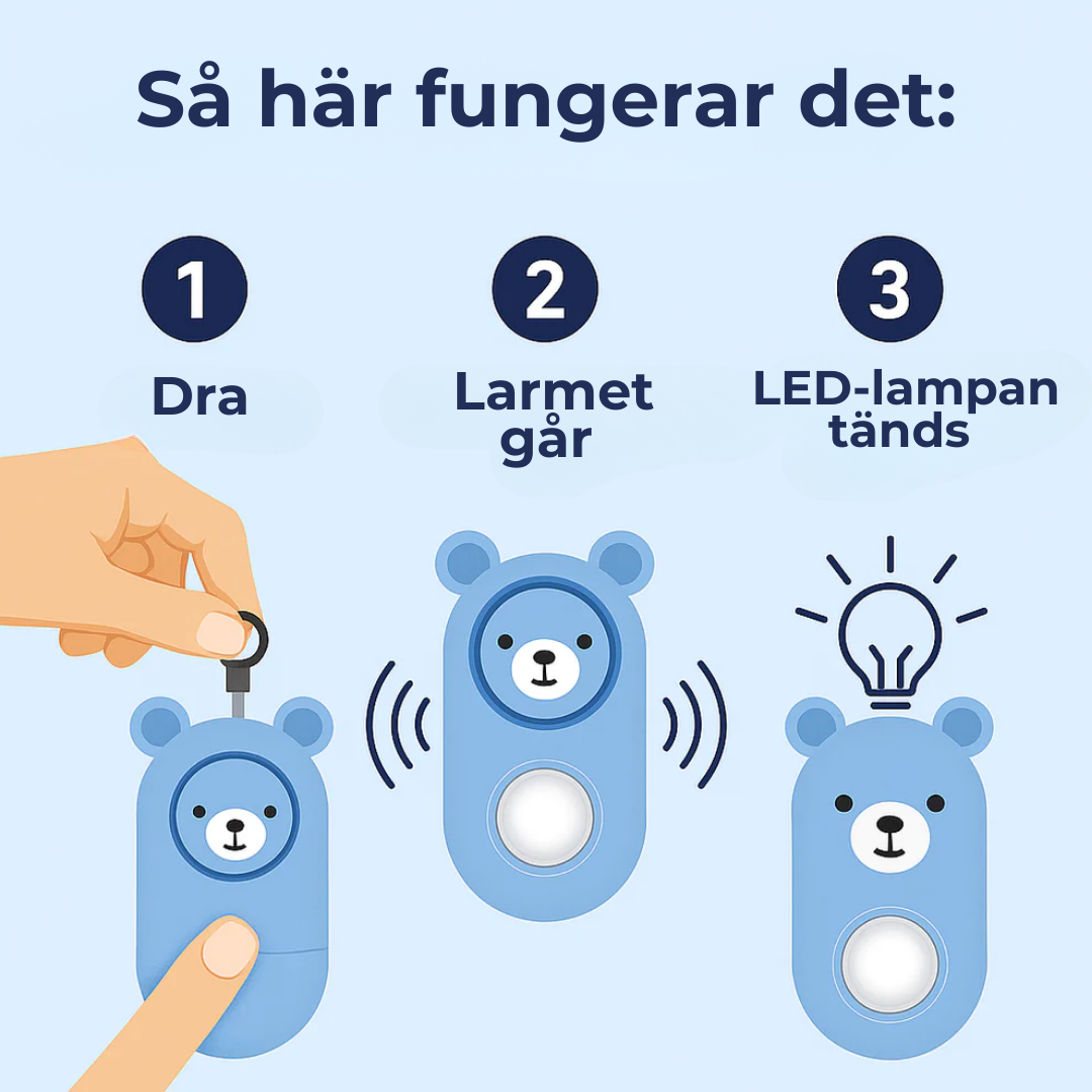 Produkten är kompakt, praktisk och designad för att omedelbart ge en känsla av säkerhet när du reser ensam. Den kan enkelt fästas på en väska, nyckelring eller ryggsäck och kan snabbt användas i en nödsituation.